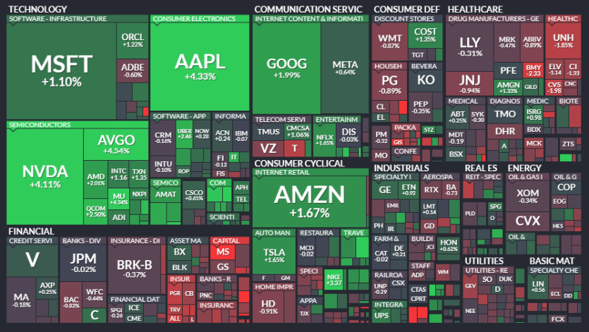 S&P 500 지수는 5,200선, 나스닥 100 지수는 1.6% 상승했습니다.