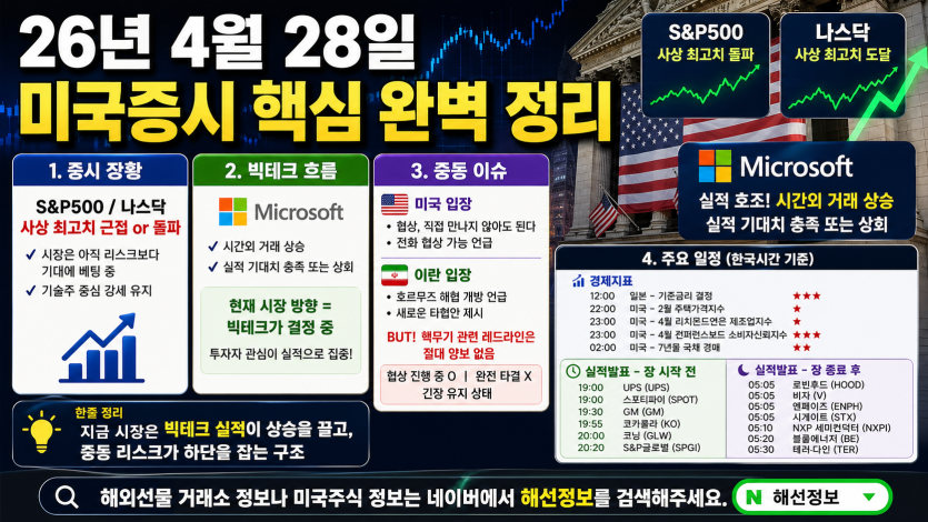 26년 4월 28일 미국증시 핵심 정리 나스닥 사상 최고치 빅테크 실적과 중동 리스크